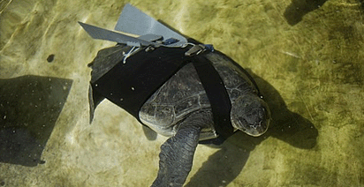Una tortuga marina que perdió sus dos aletas izquierdas al enredarse en una red de pesca ha vuelto a nadar gracias a esta prótesis. No podrá volver al mar pero le esperan grandes planes.